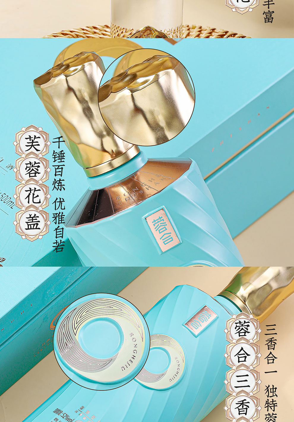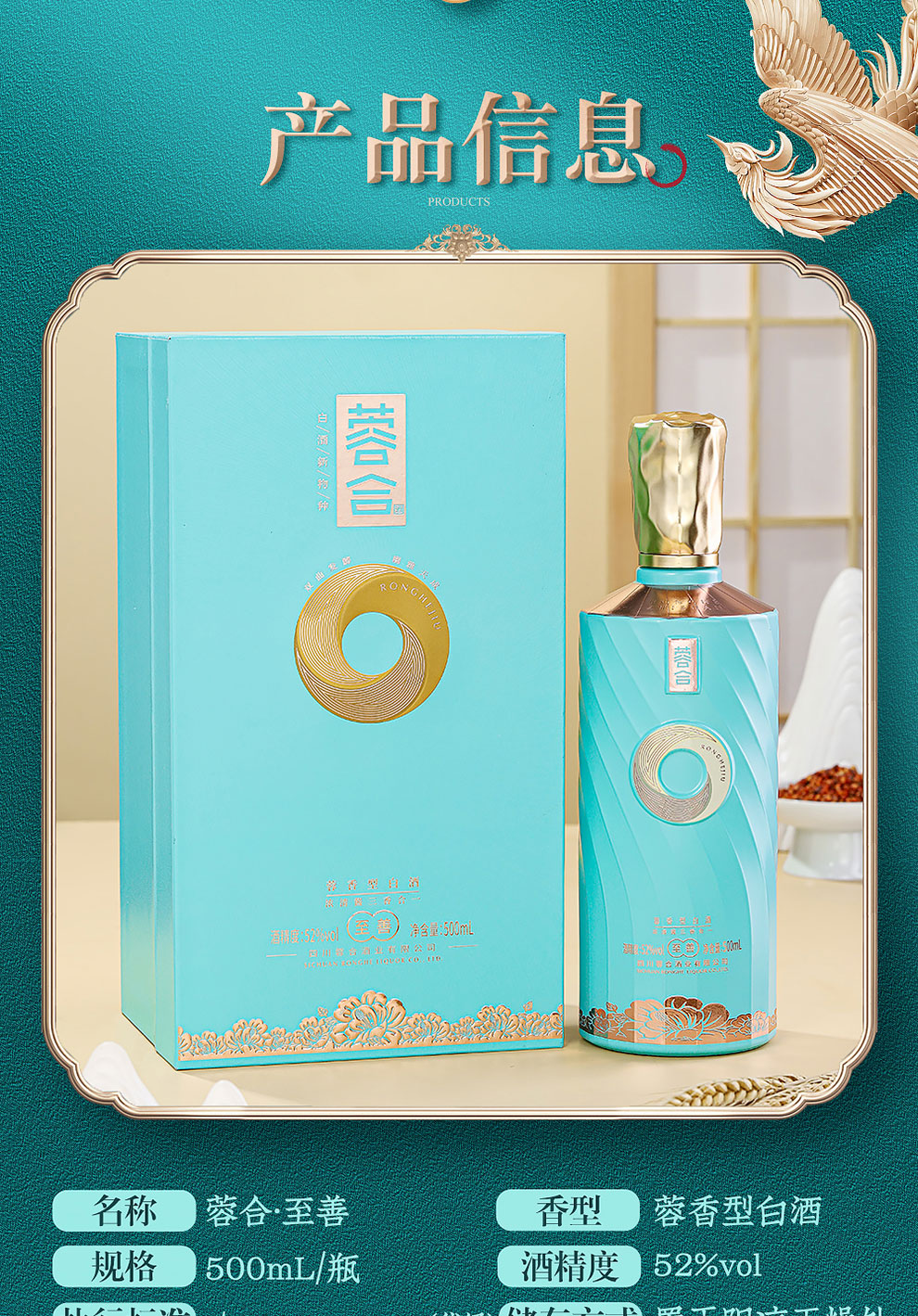 “蓉合”独特的超级视觉符号:蓉合三香环,其灵感来源于古老的金沙图腾太阳神鸟,以立体视觉述说浓清酱“三香合一”,在发酵过程中自然形成蓉香型白酒独特风格。蓉合莫比乌斯环:蓉合酿酒工艺传承与发展周而复始,生生不息。