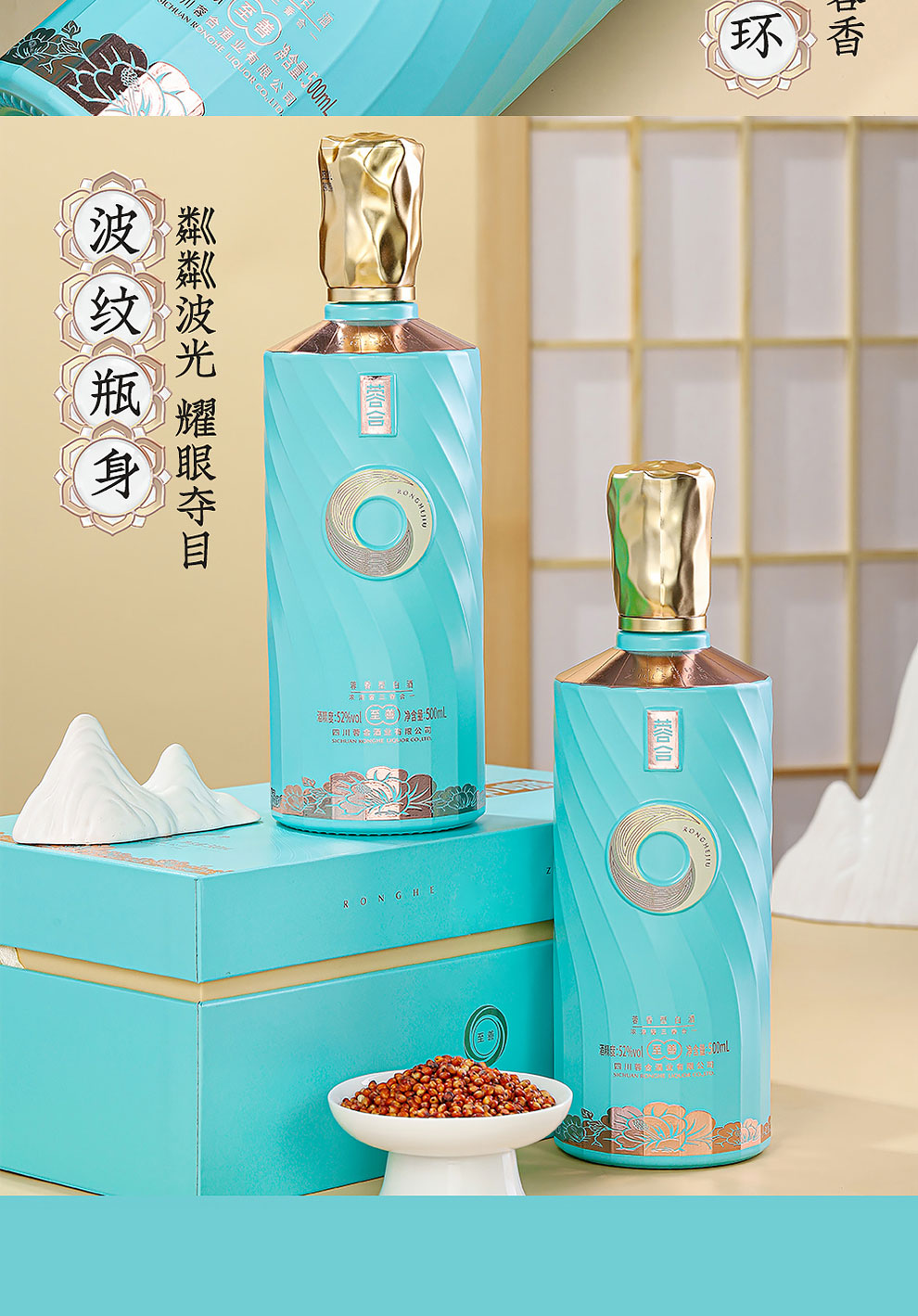 瓶身:细腻、质感的波浪纹理,如粼粼波光耀眼夺目,上曲下直的纹理布局,表达人生宛如海浪蜿蜒曲直须经历,方能汇大海。
