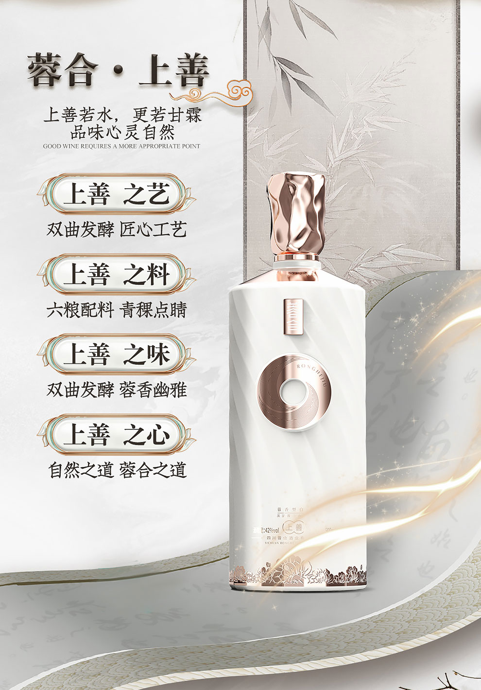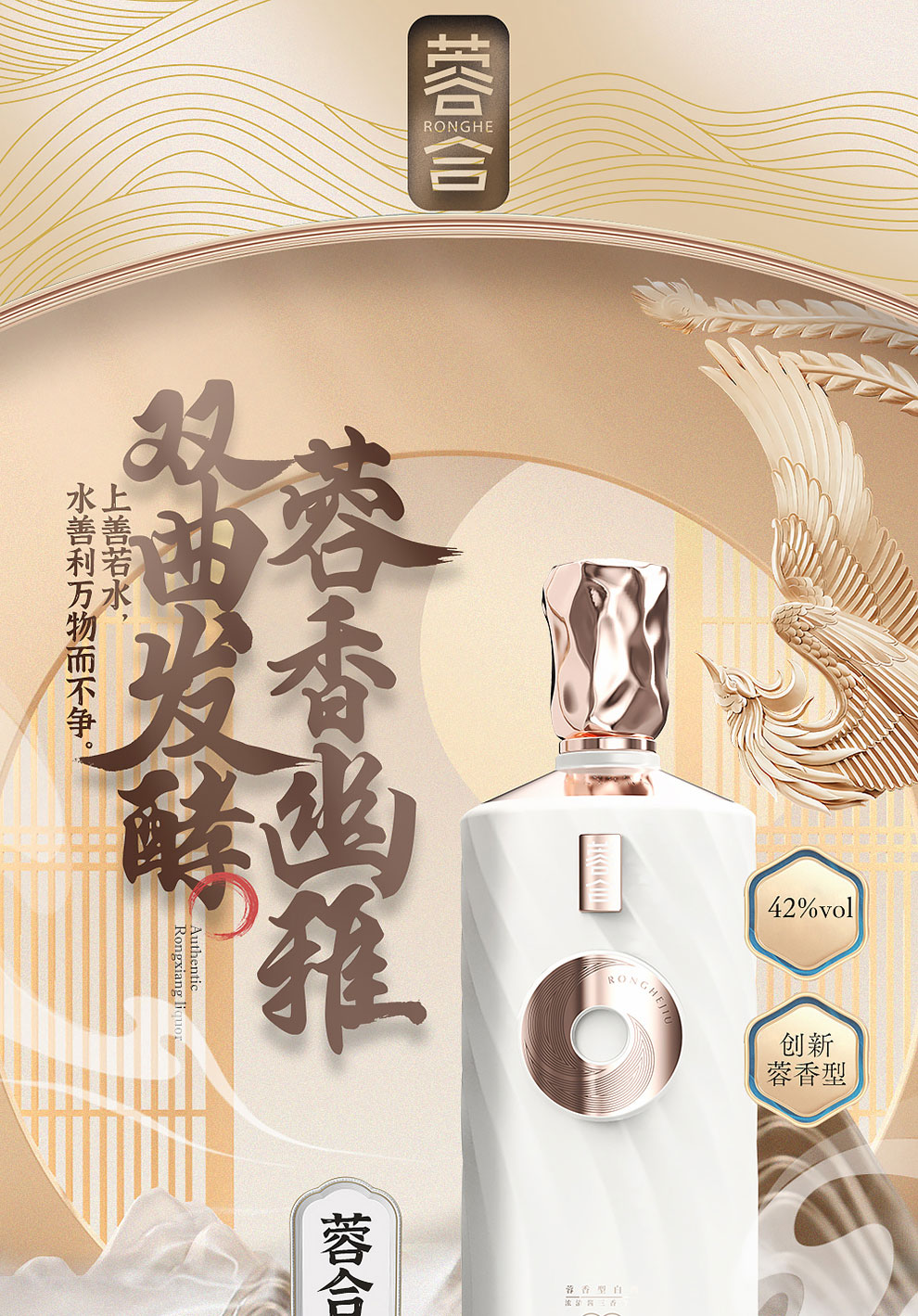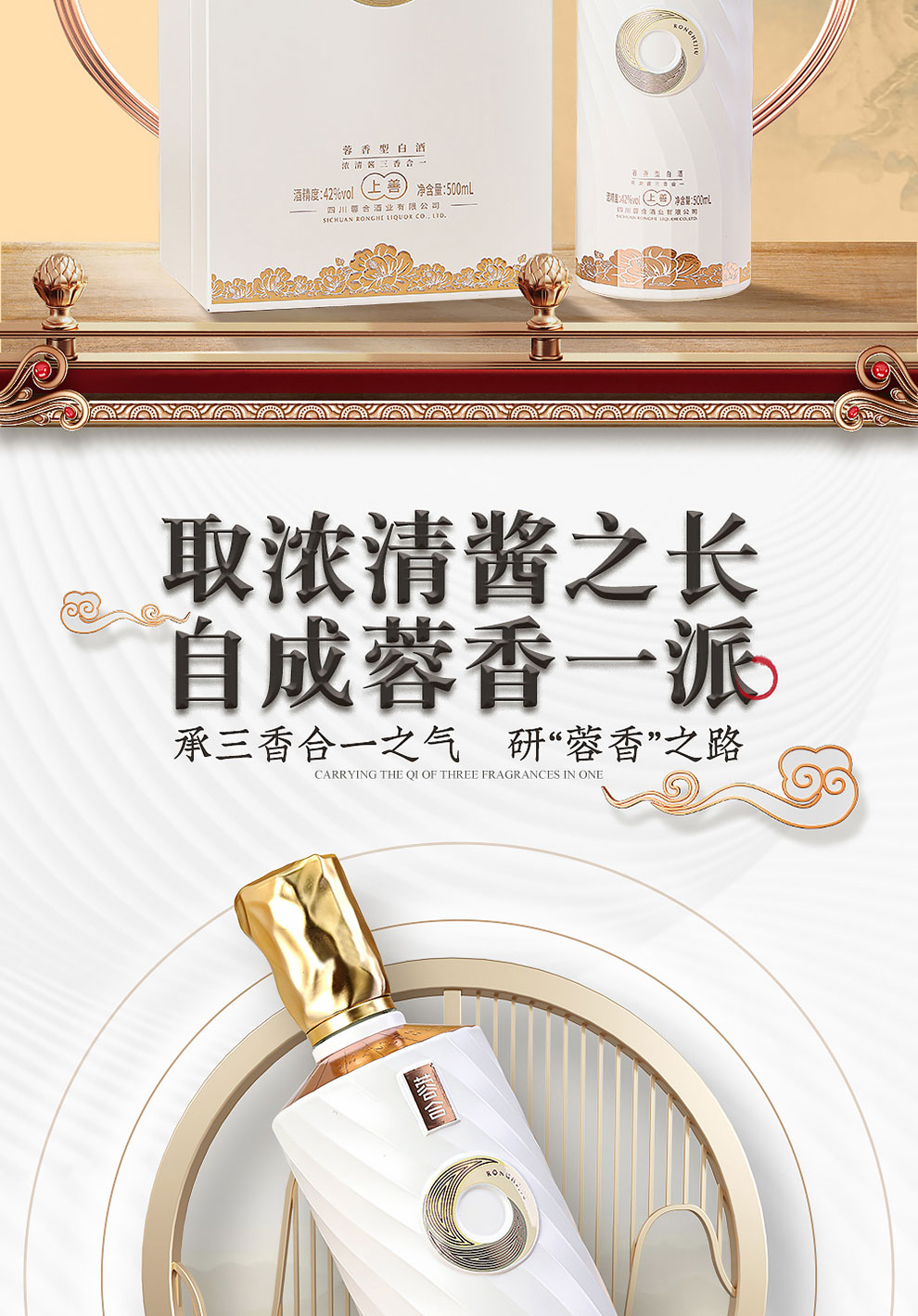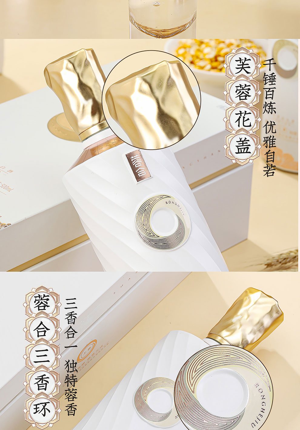 “蓉合”独特的超级视觉符号:蓉合三香环,其灵感来源于古老的金沙图腾太阳神鸟,以立体视觉述说浓清酱“三香合一”,在发酵过程中自然形成蓉香型白酒独特风格。蓉合莫比乌斯环:蓉合酿酒工艺传承与发展周而复始,生生不息。