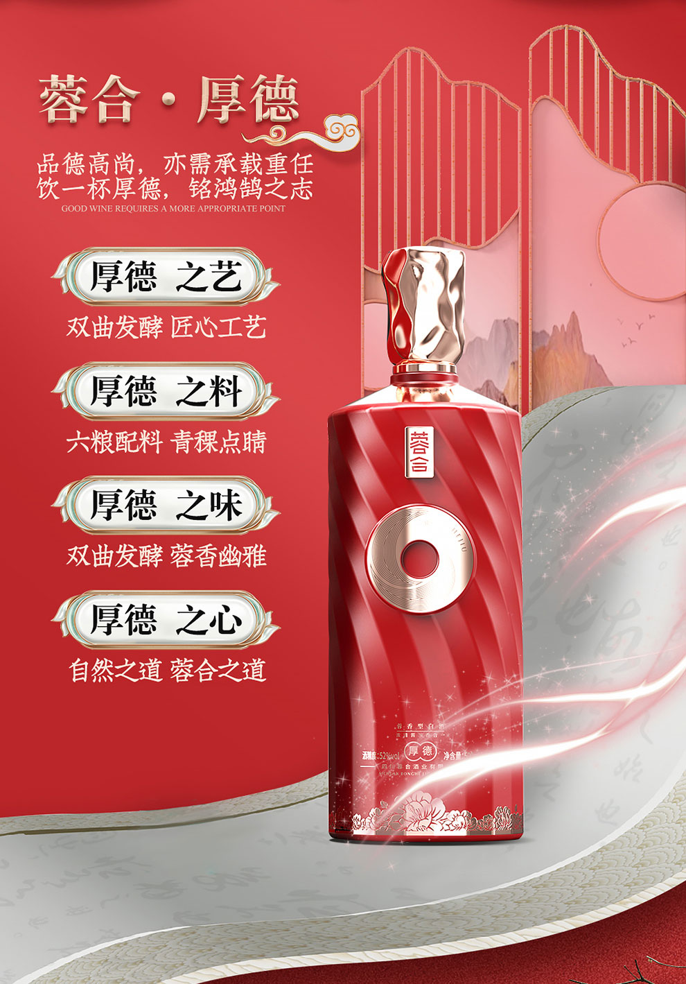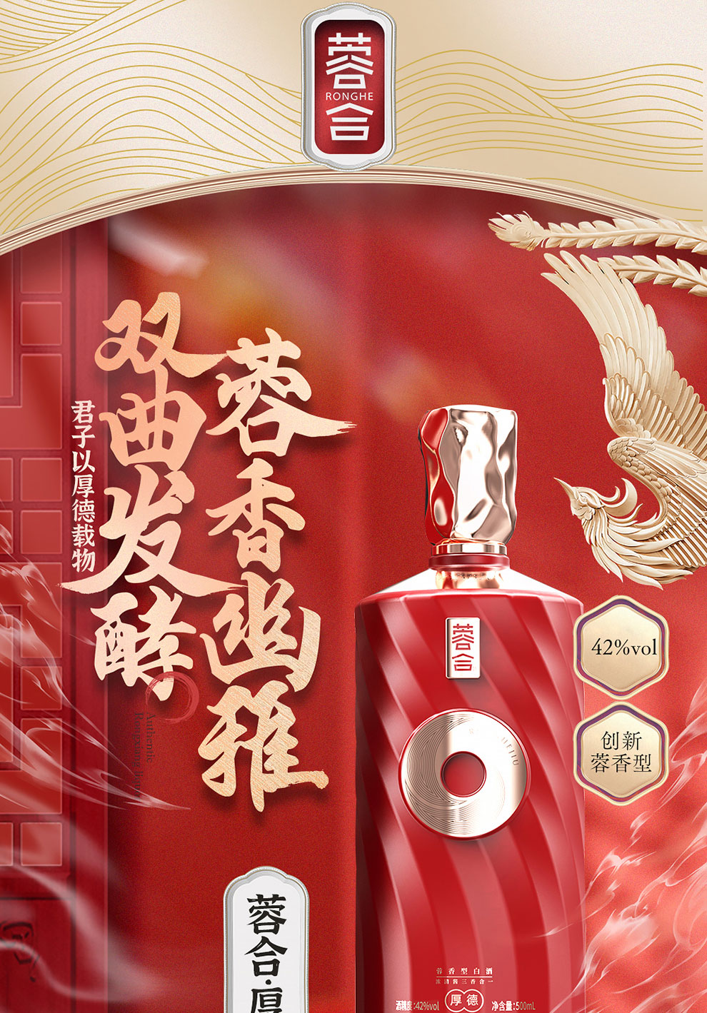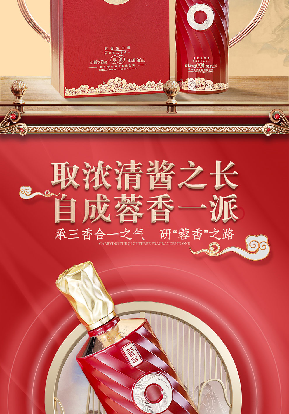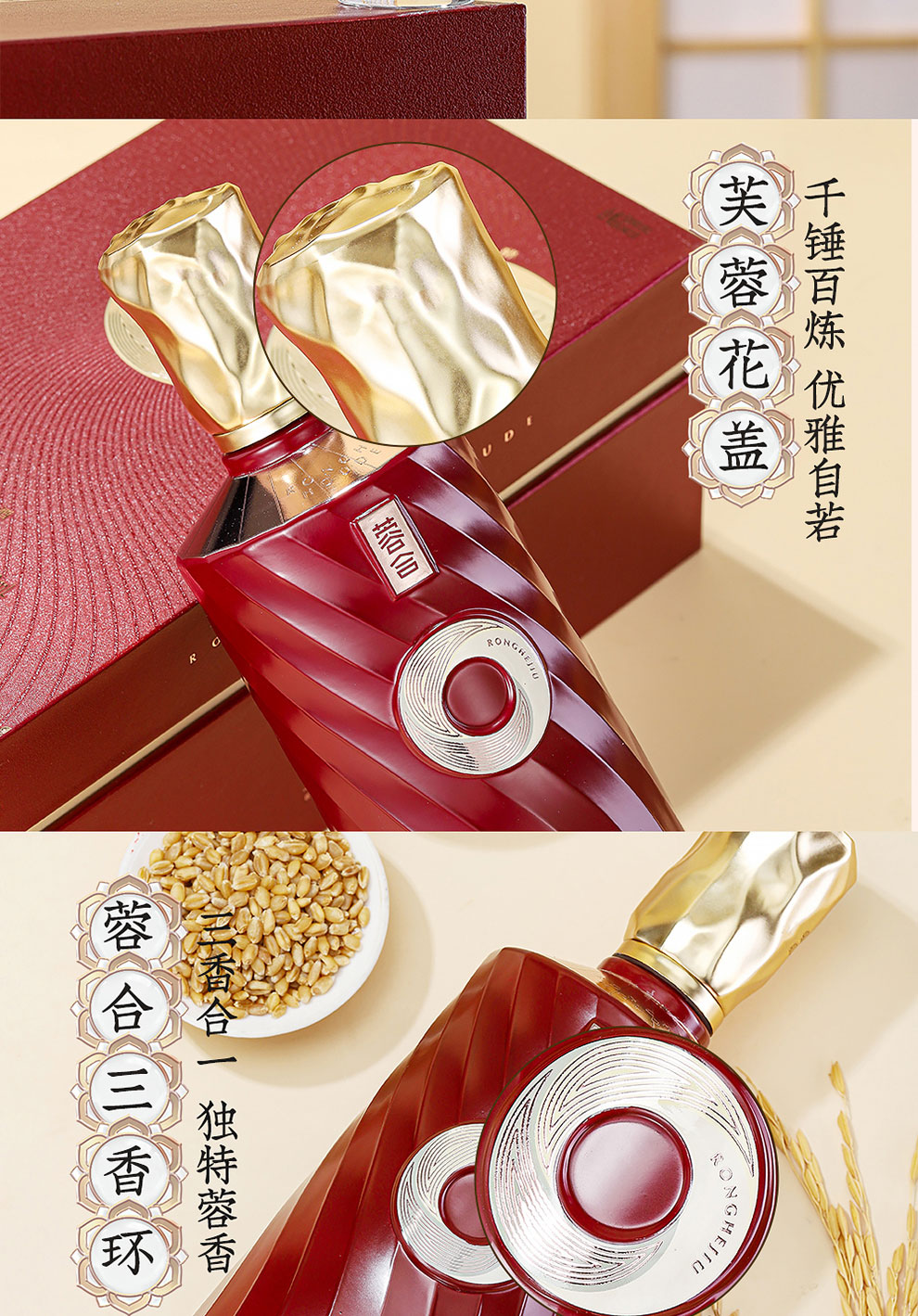 “蓉合”独特的超级视觉符号:蓉合三香环,其灵感来源于古老的金沙图腾太阳神鸟,以立体视觉述说浓清酱“三香合一”,在发酵过程中自然形成蓉香型白酒独特风格。蓉合莫比乌斯环:蓉合酿酒工艺传承与发展周而复始,生生不息。