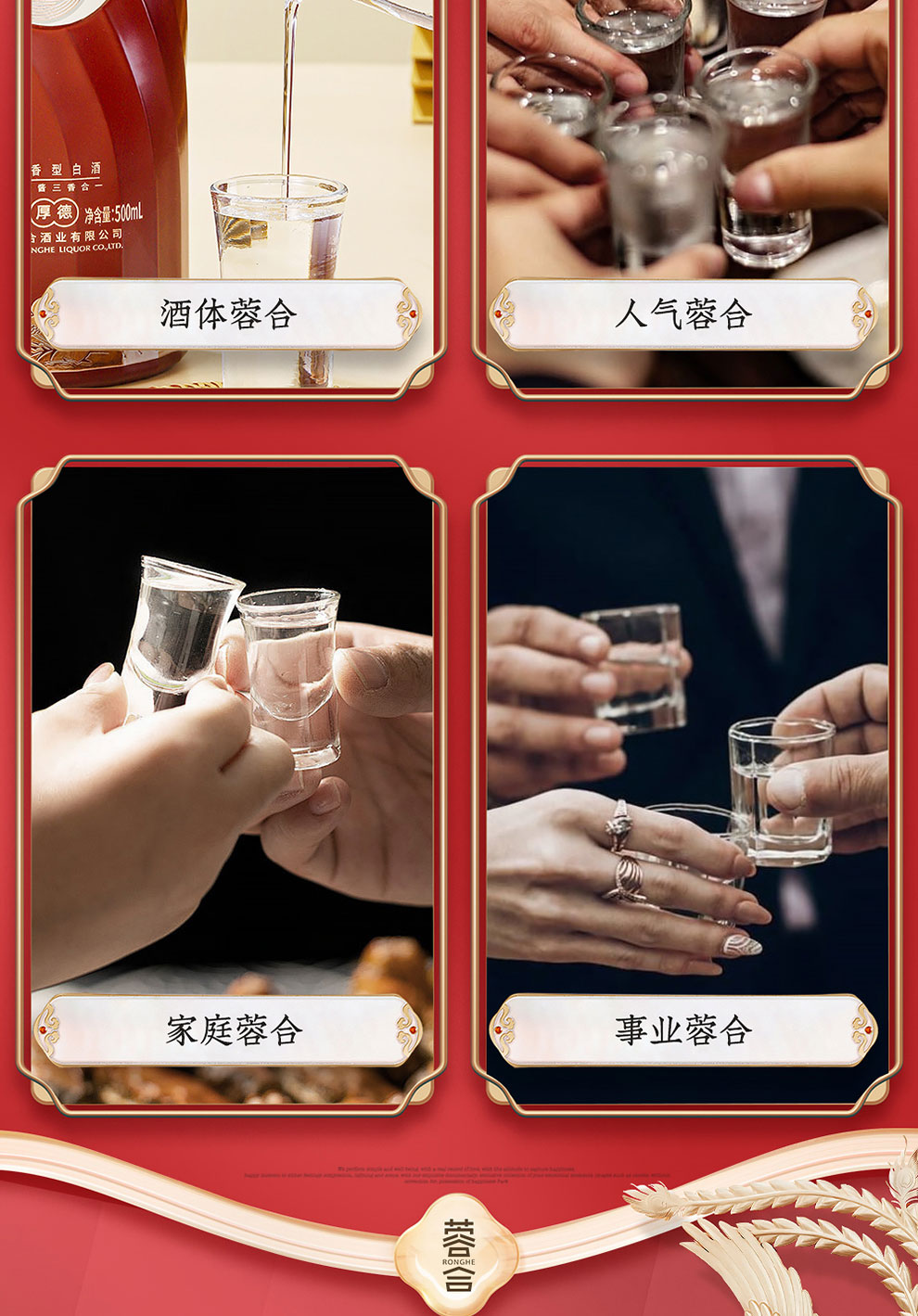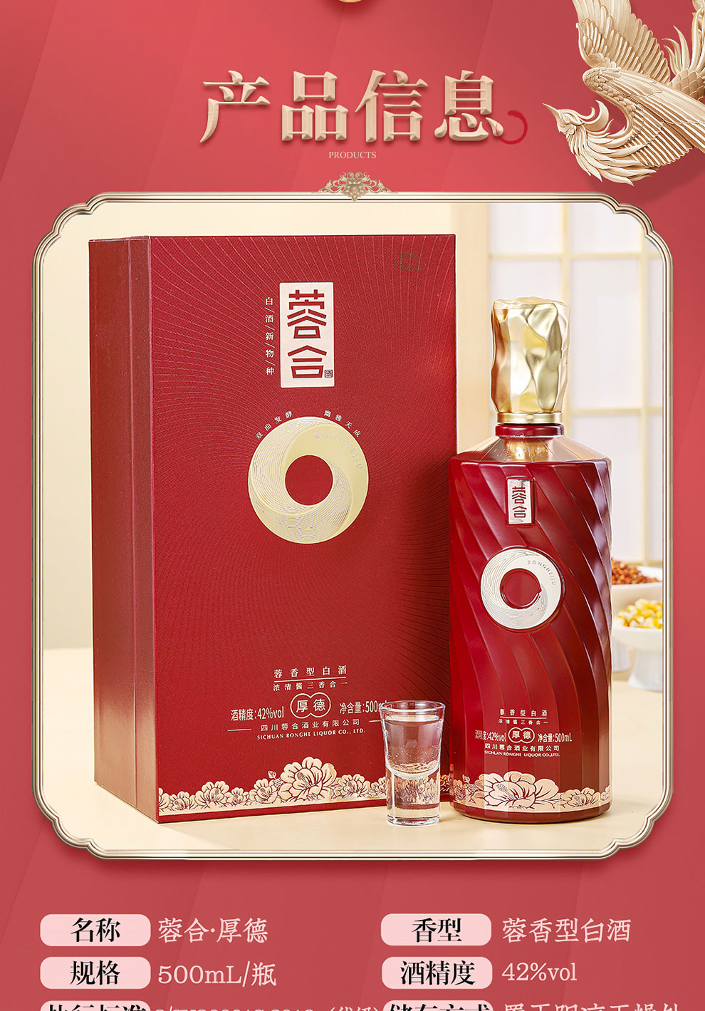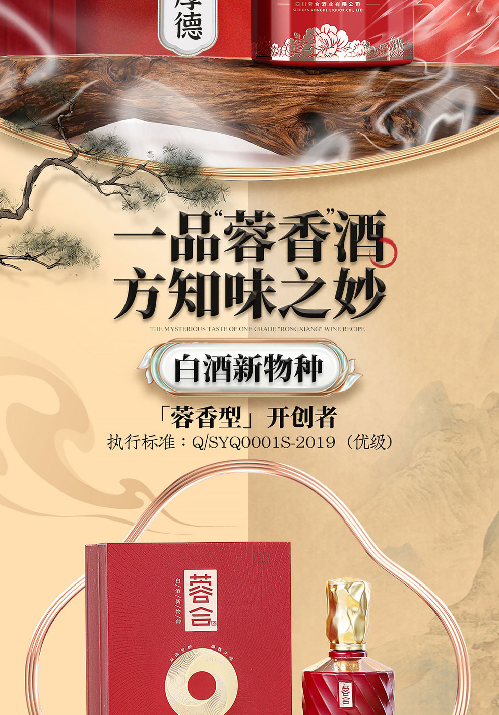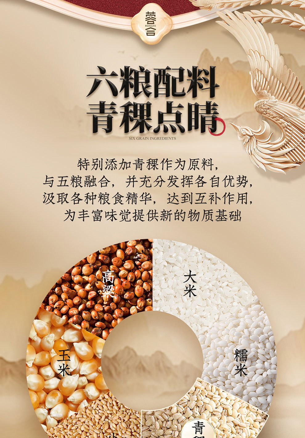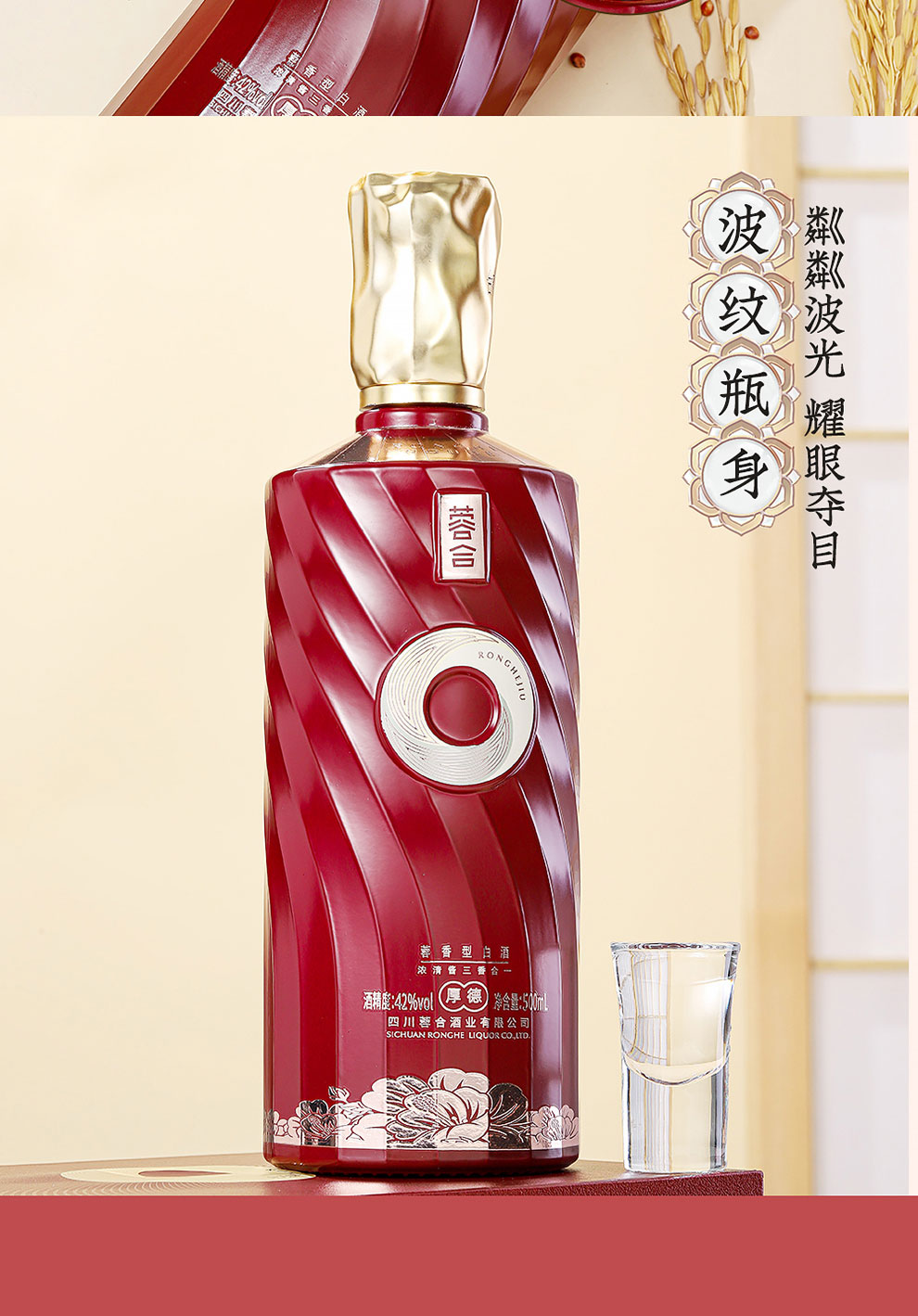 “蓉合”独特的超级视觉符号:蓉合三香环,其灵感来源于古老的金沙图腾太阳神鸟,以立体视觉述说浓清酱“三香合一”,在发酵过程中自然形成蓉香型白酒独特风格。蓉合莫比乌斯环:蓉合酿酒工艺传承与发展周而复始,生生不息。